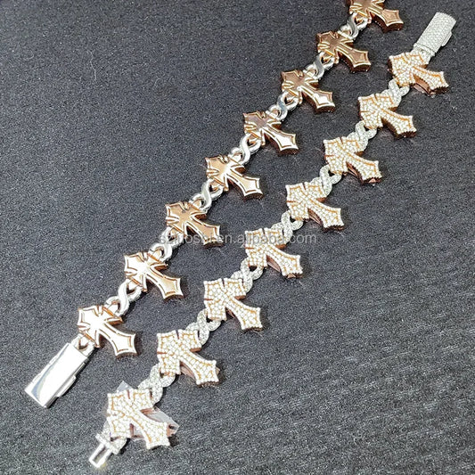S925 sterling silver 8*26mm cross design white gold mix rose gold plated hip hop jewelry iced moissanite cuban bracelet men